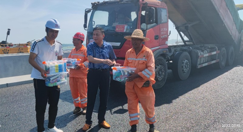 近日持續(xù)高溫、烈日炎炎,S325六安馬頭至長集段新建工程奮戰(zhàn)正酣。項目建設單位領導關心一線施工人員的身心健康,7月12日上午,市交通運輸局黨組成員、總工程師程本文等一行到S325項目開展“夏日送清涼”慰問活動,給奮戰(zhàn)在高溫一線的施工人員送來防暑降溫用品,為炎炎夏日下的施工人員帶來一絲“清涼”。