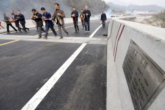11月10日,大別山旅游扶貧快速通道水毀修復(fù)工程漁潭段改線建成通車。當(dāng)?shù)卮迕袂描尨蚬?、載歌載舞,以自己特有的方式歡慶這一時刻的到來.