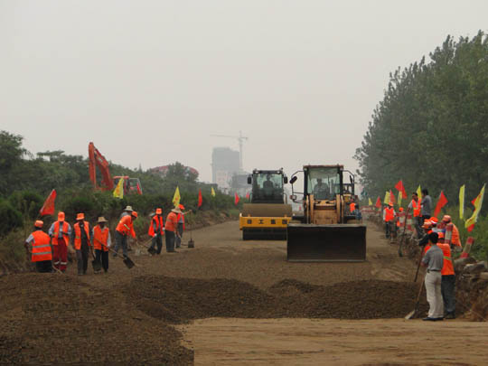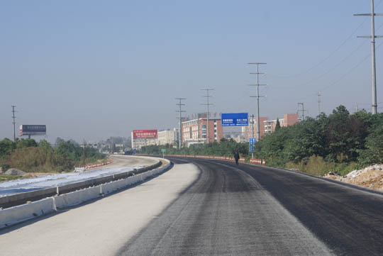 為迎接2012年11月10日在金太陽國際會展中心開幕的第三屆中國國際羽絨節(jié),六安市交通公路實(shí)業(yè)有限公司臨危受命承建G312六安段(金橋西至皖西大道)改建工程延伸段。該工程起于K565+330皖西大道大交叉口處,終點(diǎn)位于K567+200迎賓大道交叉口處,全長1870米,老路為雙向四車道一級公路,路基寬24米,采用下挖反填法,碎石化路面。公司上下克服資金緊、工期短、施工難度大等困難,放棄假日休息,全力以赴,日夜奮戰(zhàn),確保按時、按質(zhì)、按量完成該工程。目前1.1公里換板修補(bǔ)和面層碎石化已結(jié)束,700米挖方段的級配碎石回填已完成,正在進(jìn)行水穩(wěn)攤鋪,預(yù)計10月25日完成主體工程。為六安的招商引資創(chuàng)造良好交通環(huán)境,為展示“五色、精彩”六安形象添彩。