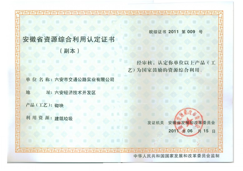 六安市交通公路實(shí)業(yè)有限公司在路面大中修中利用瀝青路面冷再生技術(shù)綜合利用廢棄的建筑垃圾,實(shí)現(xiàn)了老舊路面固體廢棄物回收再利用。被認(rèn)定為2011年安徽省第一批資源綜合利用企業(yè),省發(fā)改委頒發(fā)《資源綜合利用認(rèn)定證書(shū)》。